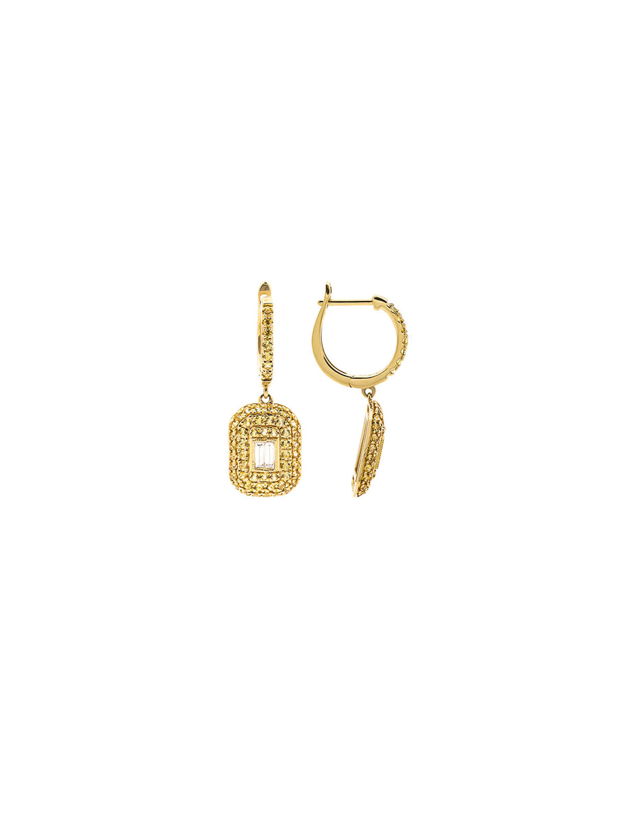 Glamorize your entire look with the power of these dangle drop earrings! These pave cluster boast 1.20cts. t.w. round yellow sapphires & 0.19cts baguette diamonds in 18K yellow gold.