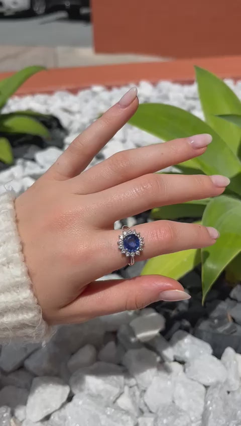 Beautiful statement halo ring. This ring features 2.49ct in Sri Lanka Sapphire and 0.69ct. t.w. diamonds. Set in Platinum.
