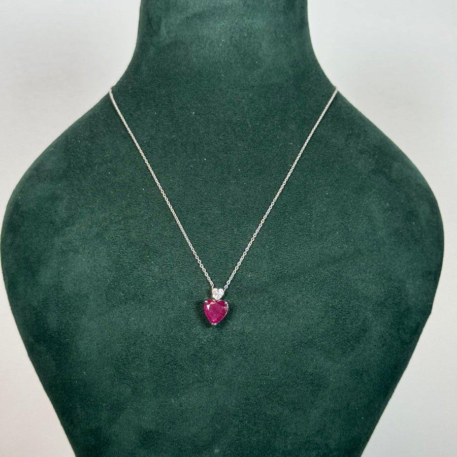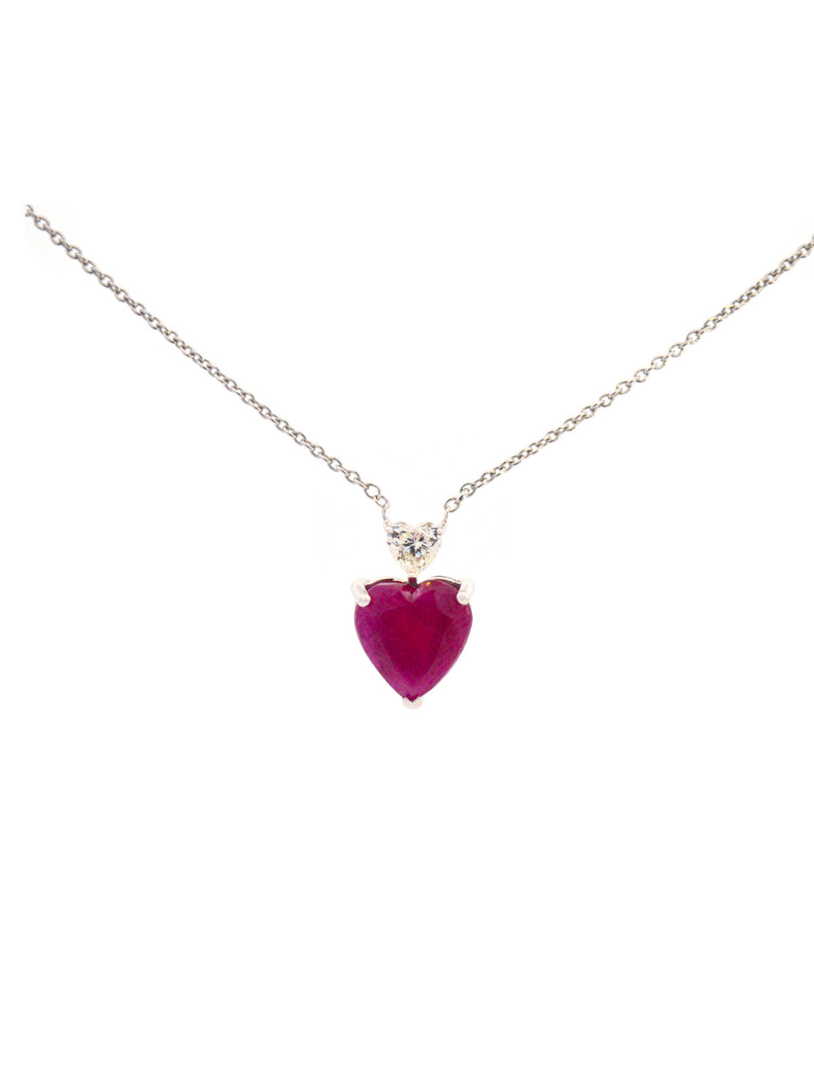 Celebrating love with this heart pendant chain necklace! 2.82ct heart-shaped ruby and 0.25ct heart-shaped in diamonds. Crafted in 18K white gold. With spring ring clasp.