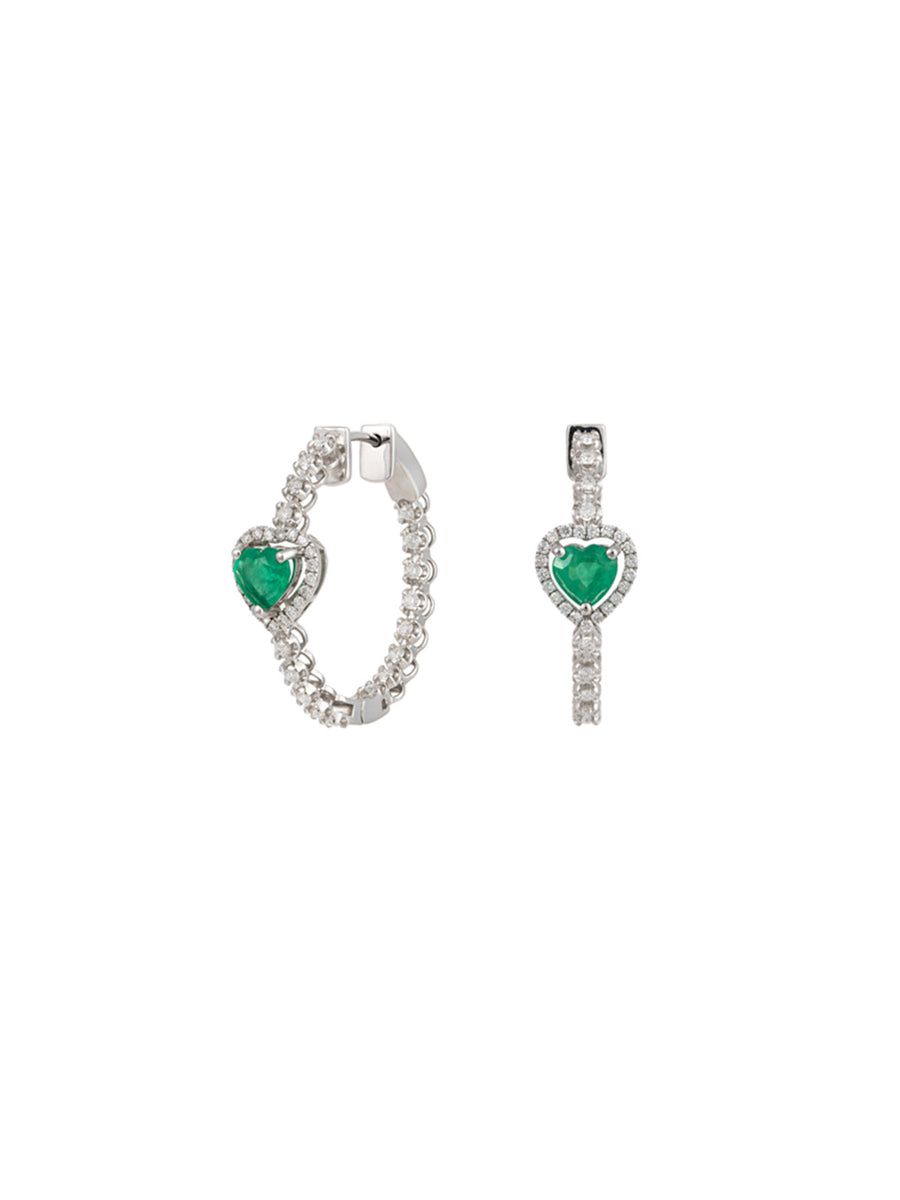 Made for the lovers! Features 0.71ct diamonds and 1.29ct in heart cut emeralds. Crafted in 18K White Gold. Huggies post.