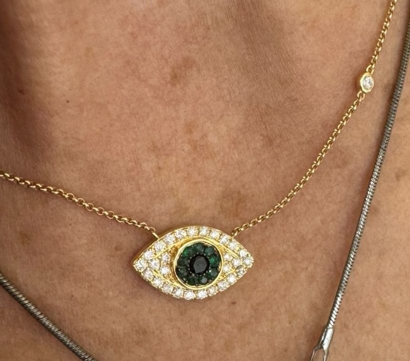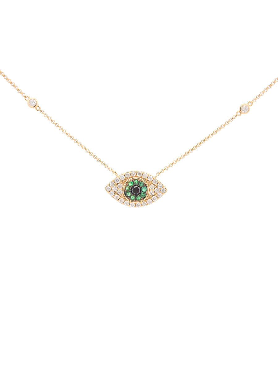 With a stylish look. This eye necklace features 0.556ct t.w. diamonds and 0.12ct in emerald. Set in 18K Yellow Gold.