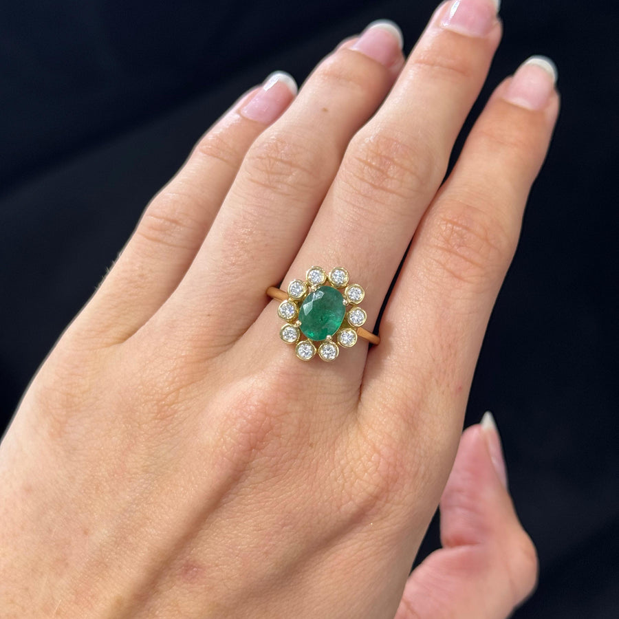 1.90ct Diamond Emerald 18K Gold Bezel Halo Ring