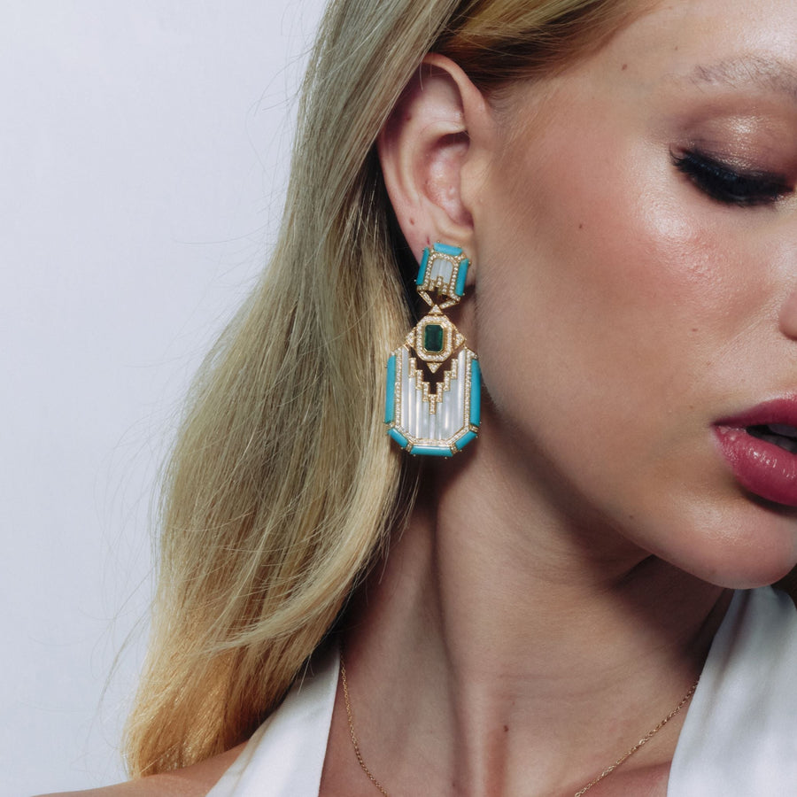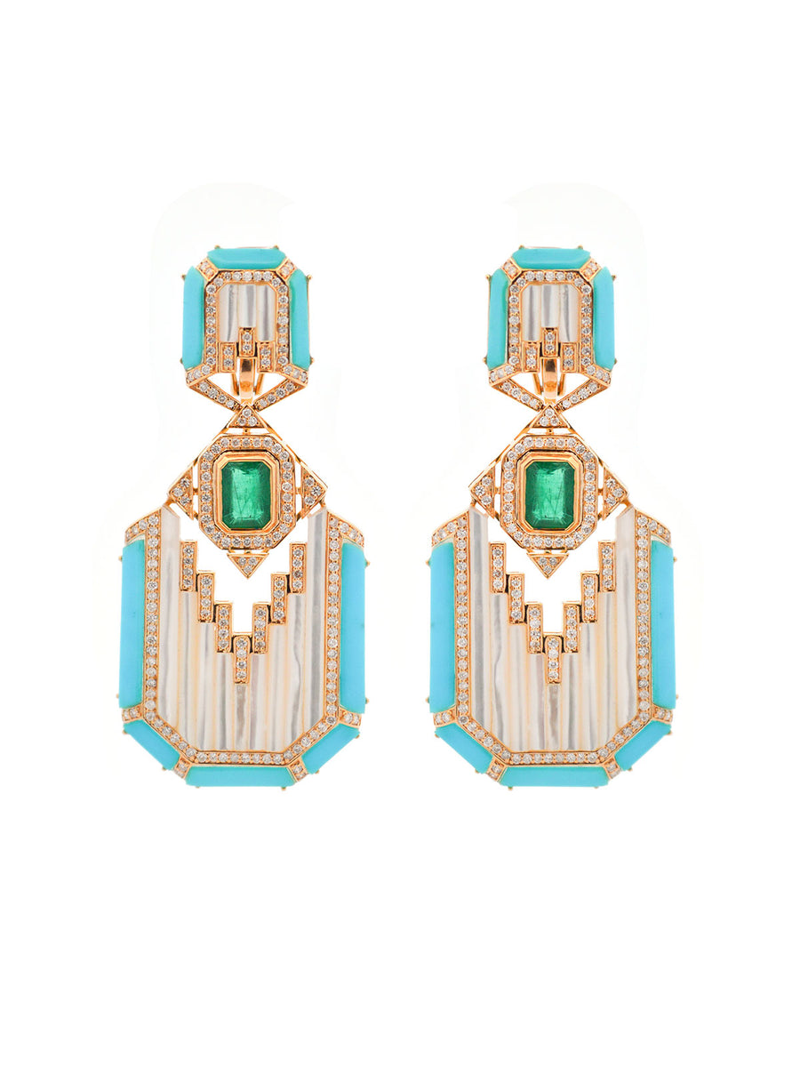 3.79ct Diamond & Emerald & Turquoise 18K Gold Statement Earrings