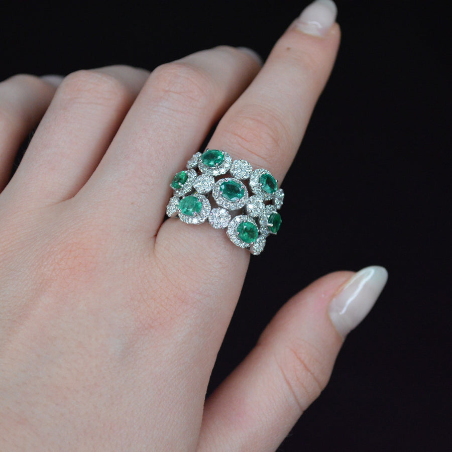 4.05ct Diamond Emerald 18K Gold Cluster Band Ring