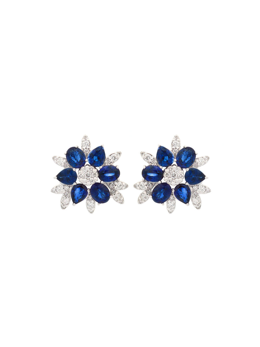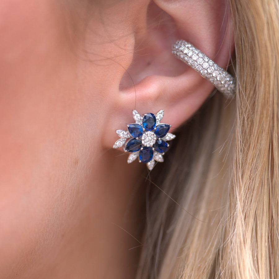 3.89ct Diamond Blue Sapphire 18K Gold Flower Stud Earrings