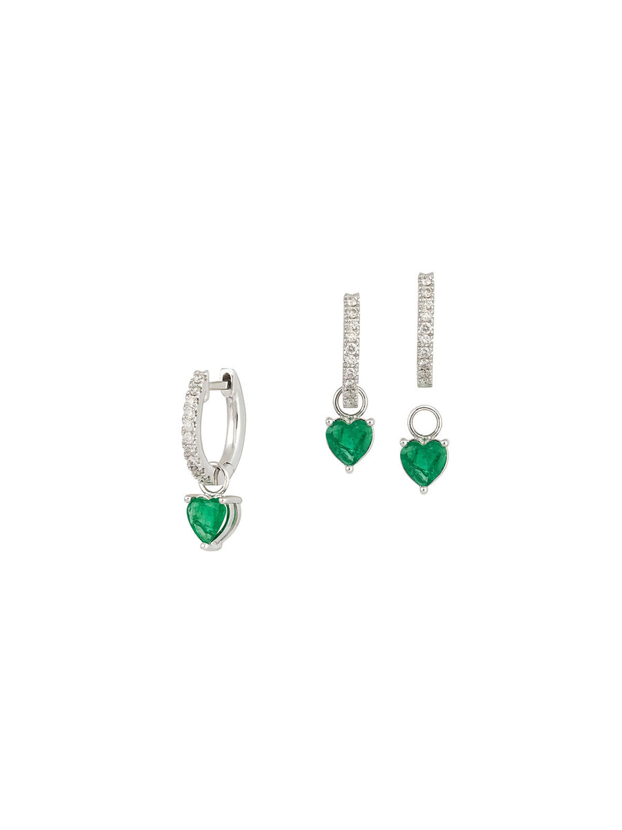 Everyday accessorizing with these versatile huggie hoop earrings with 1.28cts removable dangle drop heart emerald and 0.14cts pave round brilliant diamonds. Set in 18K white gold. Hinged post.
