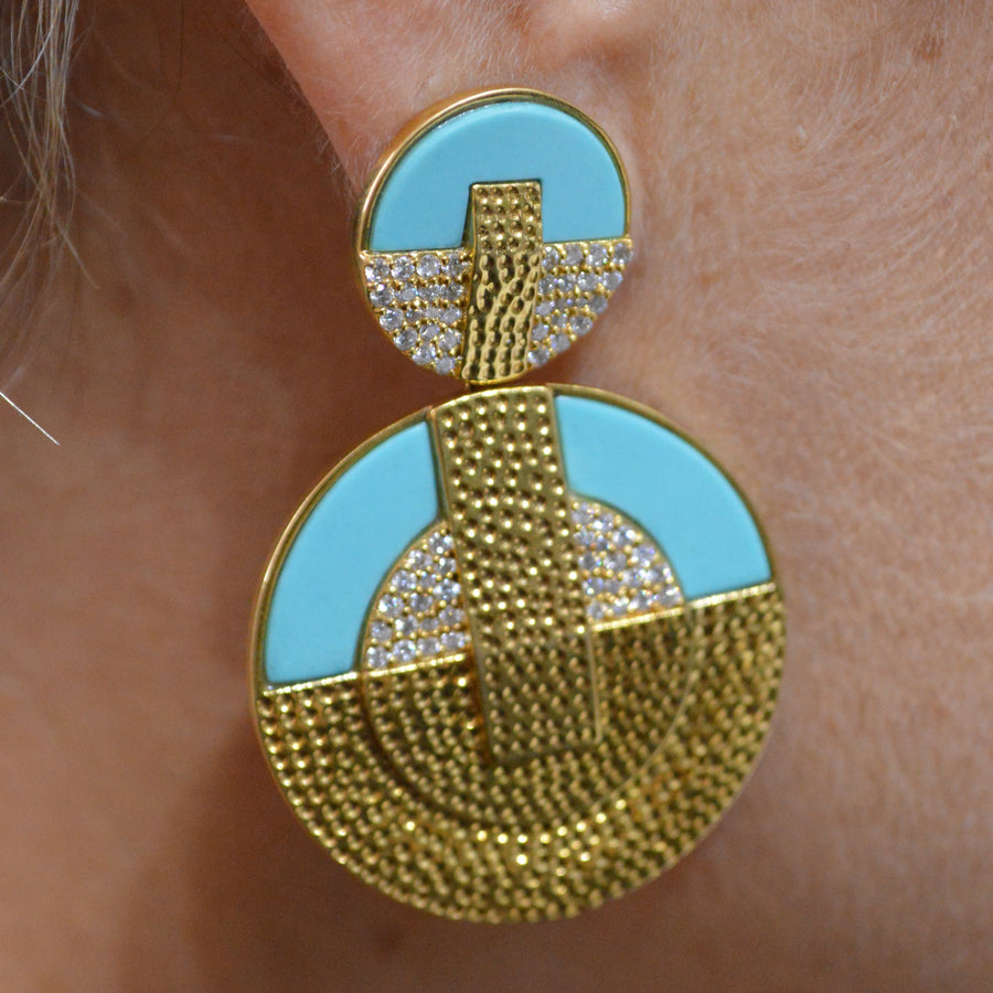 9.98ct Diamond Turquoise 18K Gold Hammered Double Disc Drop Earrings