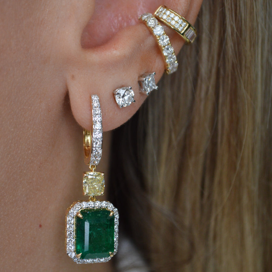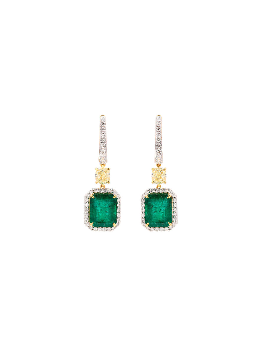 These luscious drop earrings are so rich-looking, with 10.11cts in emeralds and 3.18 cts in White & yellow colored diamonds. Crafted in 18K Yellow Gold. Push back clasp.